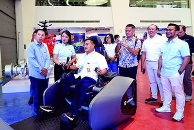 在全球研發(fā)中心展廳,代表團一行深入了解柳工從創(chuàng)立至今在技術(shù)創(chuàng)新、市場拓展等方面的輝煌成就。現(xiàn)場觀看完5G智能遙控電動裝載機的鏟裝作業(yè)演示后,代表團成員還體驗了遙控駕駛,這一智能技術(shù)應(yīng)用成果讓代表團大開眼界。