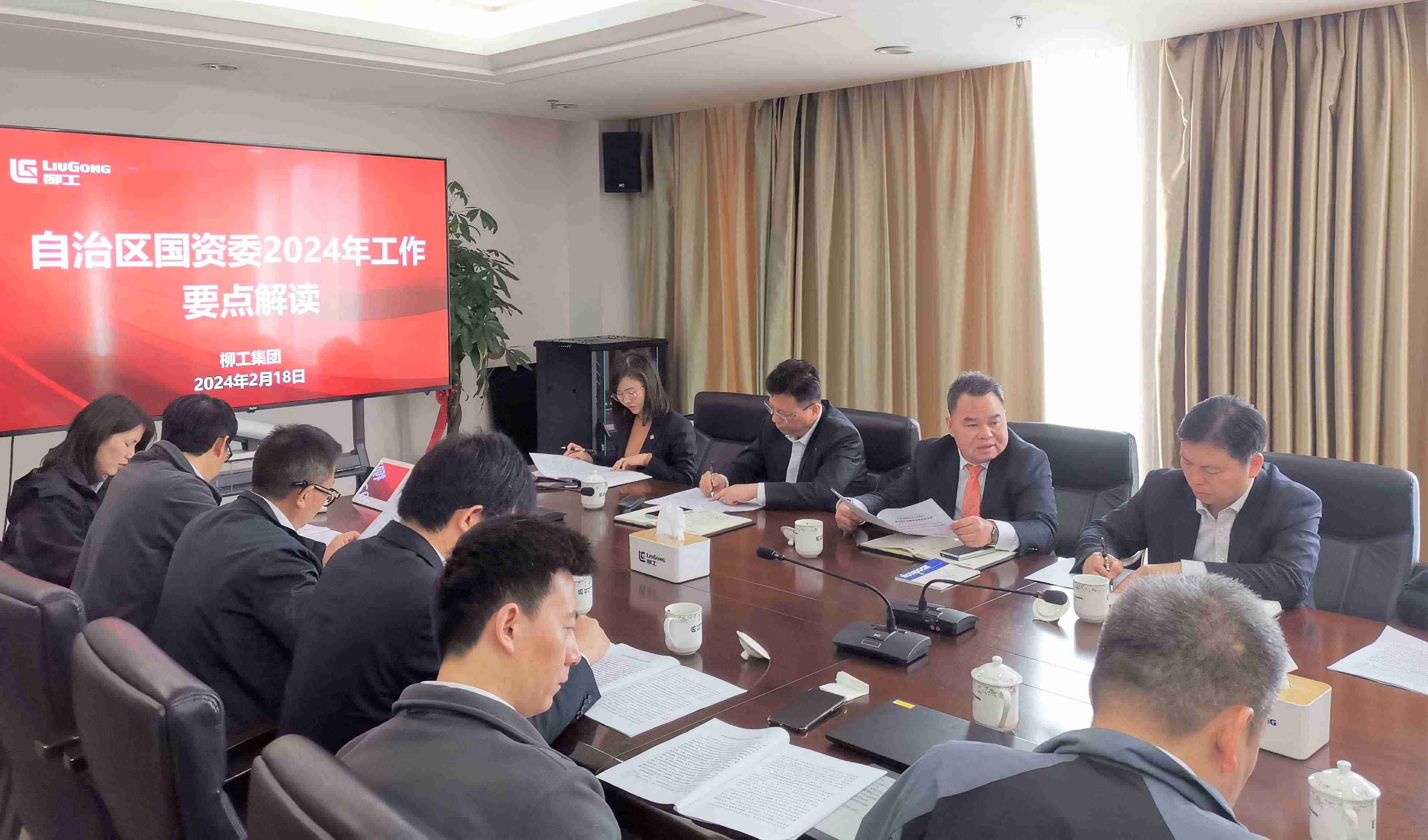 新年伊始,萬象更新。2月18日上午,春節收假后的第一個工作日,廣西柳工集團有限公司召開自治區國資委2024年工作要點解讀專題會議,傳達學習相關文件精神,并深入研究貫徹落實舉措。廣西柳工集團有限公司黨委書記、董事長鄭津主持會議,黨委副書記、副董事長、總經理王太平,黨委副書記、紀委書記、工會主席賴頌平,董事會秘書、行政總監左芳等領導班子成員出席會議,職能部門總監以及子公司運營相關負責人參加會議。