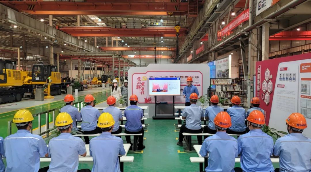 廣西柳工機械股份有限公司黨委組織一線員工,在習近平總書記視察過的柳工大型挖掘機裝配車間集中學習黨的二十大精神。