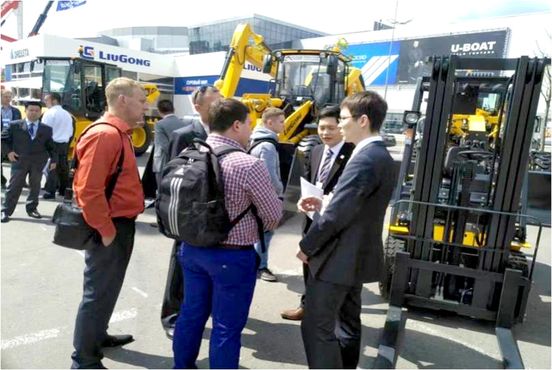 柳工俄羅斯經銷商在展會中,展出了公司全新H系列裝載機及俄語區(qū)銷售的主流工程機械產品。包括CLG835H和CLG856H型號的2臺裝載機,1臺CLG920E挖掘機,1臺CLG4215平地機,1臺CLG614H壓路機,2臺叉車以及1臺TD-15M銳斯塔推土機。